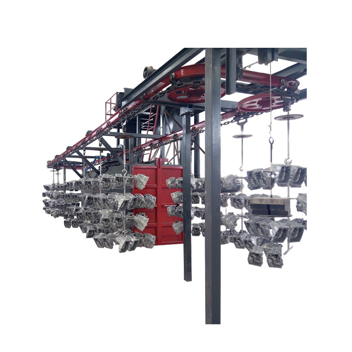 Дробеструйная установка с подвесами Q381 по подвесному рельсу заводит вращающиеся подвесы с заготовками в камеру обработки, где восемь турбин по 11 кВт каждая агрессивно воздействуют выбросом абразива на поверхности деталей. Пополнение абразивных материалов – полностью автоматический процесс. Датчик в бункере абразивных материалов контролирует их уровень. Как только тот падает ниже определенного значения, абразивы добавляются в небольших количествах. Это дает однородную рабочую смесь и гарантирует последовательные и повторяемые результаты обработки. Несмотря на компактную конструкцию, все компоненты машины, требующие обслуживания, легкодоступны.